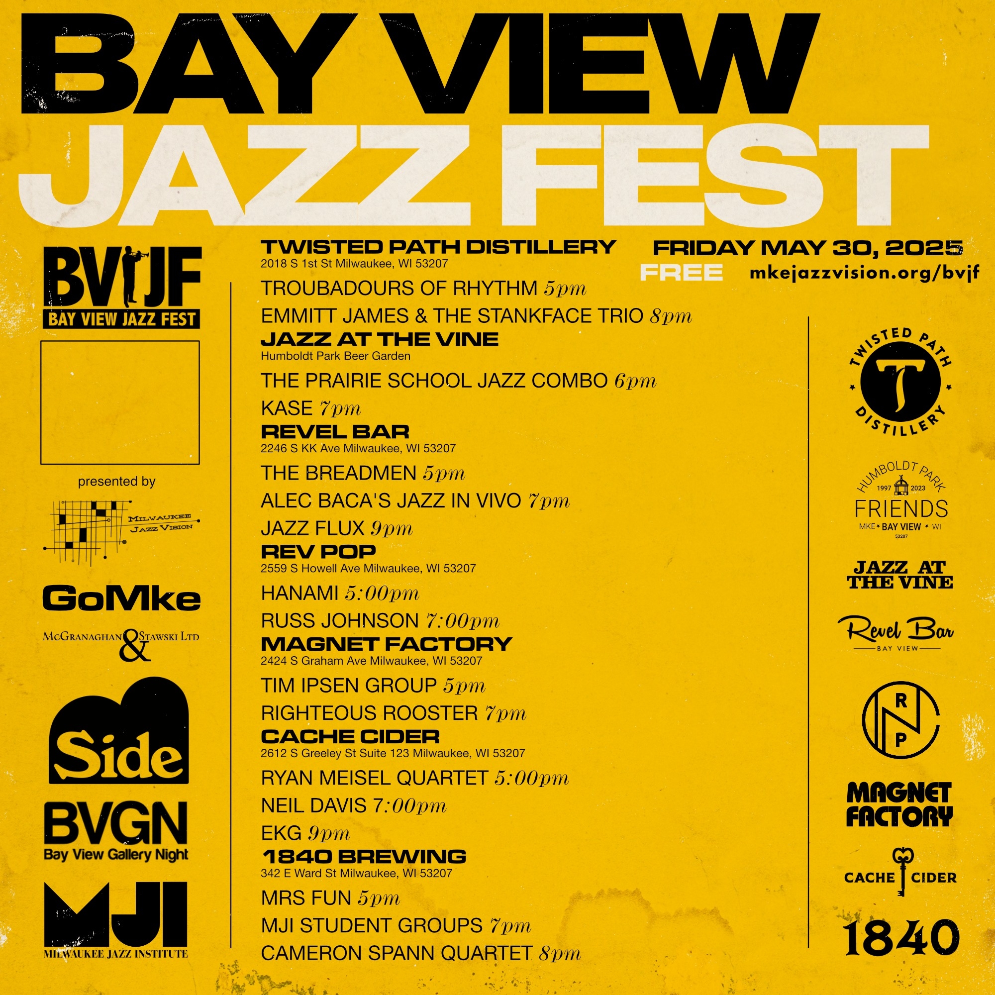 The BAY VIEW JAZZ FEST features multiple groups during the night of the spring BAY VIEW GALLERY NIGHT. The festival provides an opportunity for Milwaukee’s finest musicians to be showcased in front of the community at large. BVJF offers the general public the opportunity to experience the best of today’s new live jazz and creative music for free in a club setting. Bay View provides for an ideal festival experience, presenting groups performing all night at multiple venues within close proximity of each other. On this night the BVJF continues to redeem the rich jazz heritage of Milwaukee, WI.