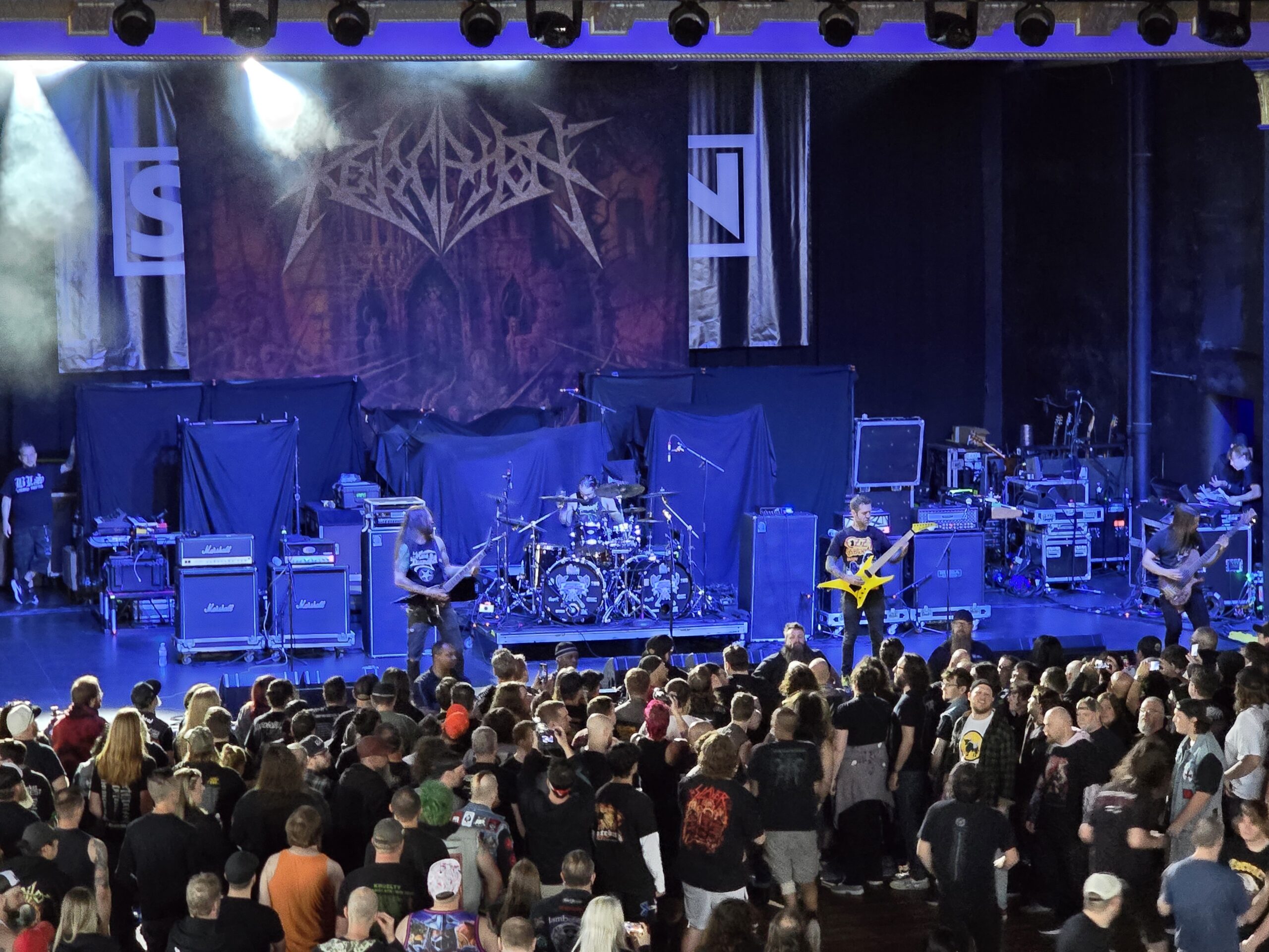 The day of thrash, filled with legends like Death Angel, Demolition Hammer, and EvilDead, and current torch-bearers such as Wraith and Revocation. Of those, Revocation were the shreddiest, meaning they were the day’s most enthralling. It’s one thing to play highly technical death-thrash. It’s another to play it while growling. And it’s another-another to do those and then idiot-grin while ripping solos. (Metalface activate!) But that’s what vocalist/guitarist/founder David Davidson, rocking a mustard-yellow guitar and matching kicks, excels at. He’s clearly mastered his instrument, and was almost certainly the best guitarist of the entire Fest, but in no way did he look bored playing. Watching him shred was simply a joy because he’s one of the few who can make techy material look cool.